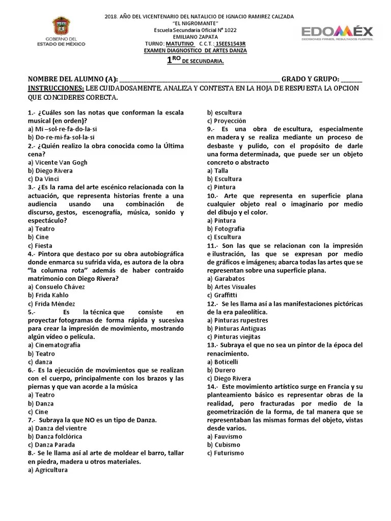 108 Examen De Artes Visuales 2 Para Secundaria Con Respuestas